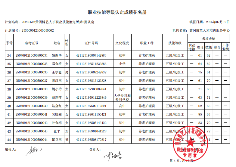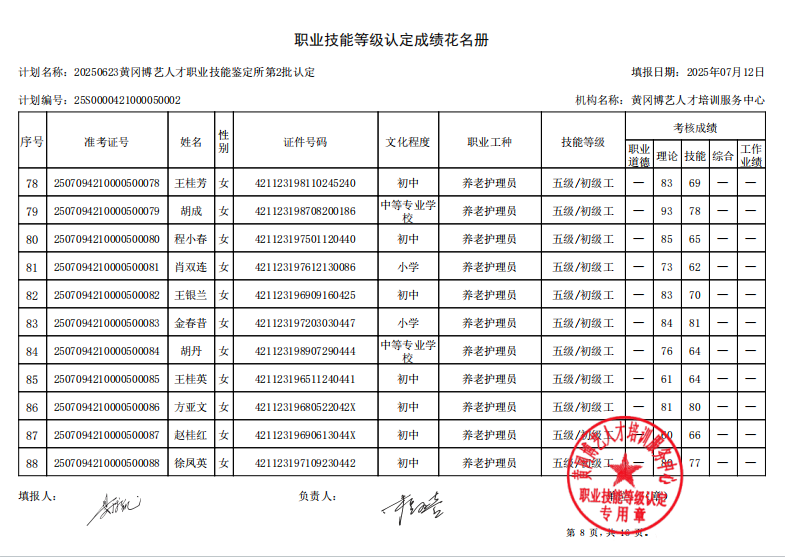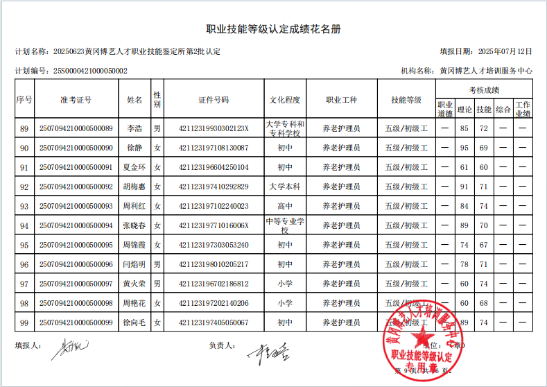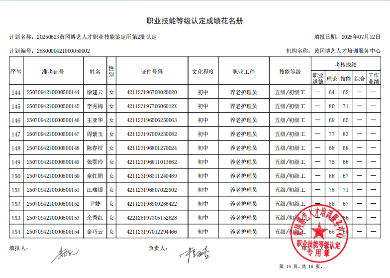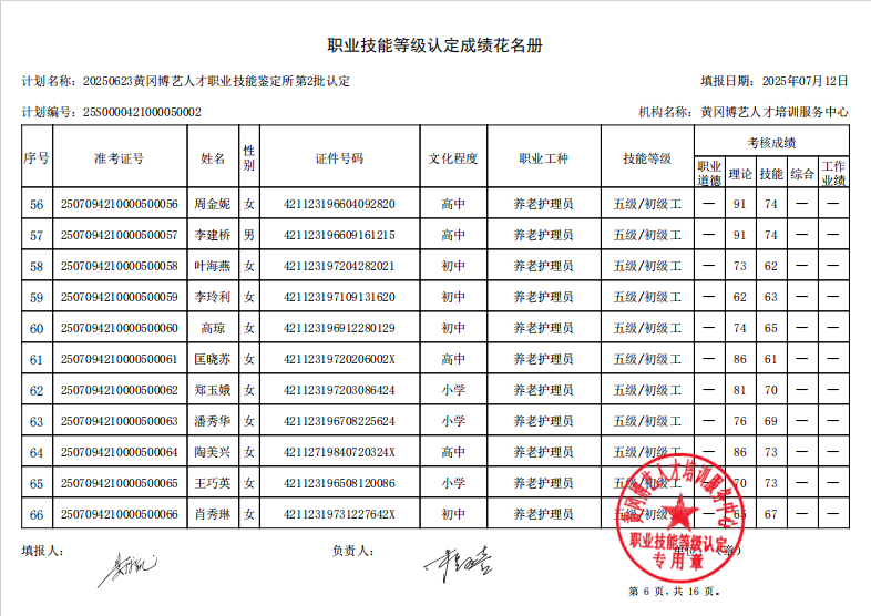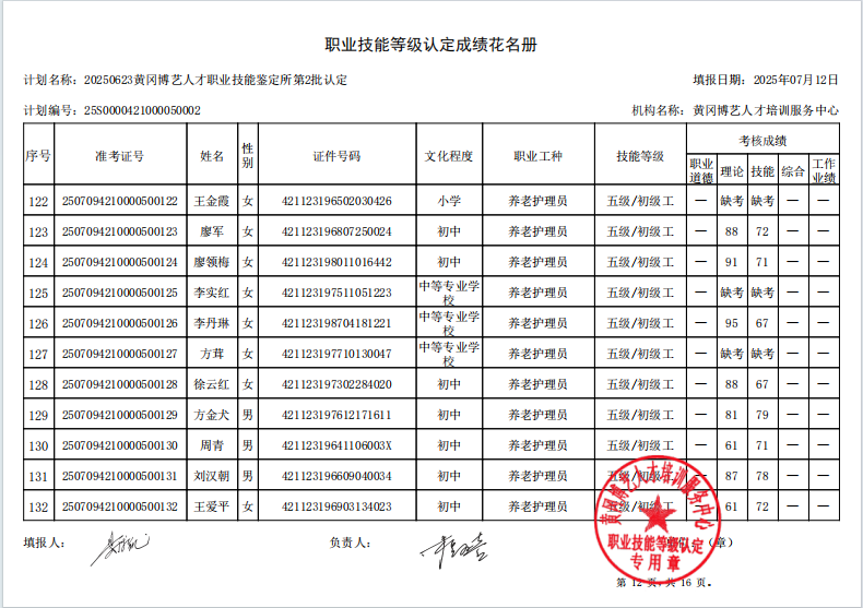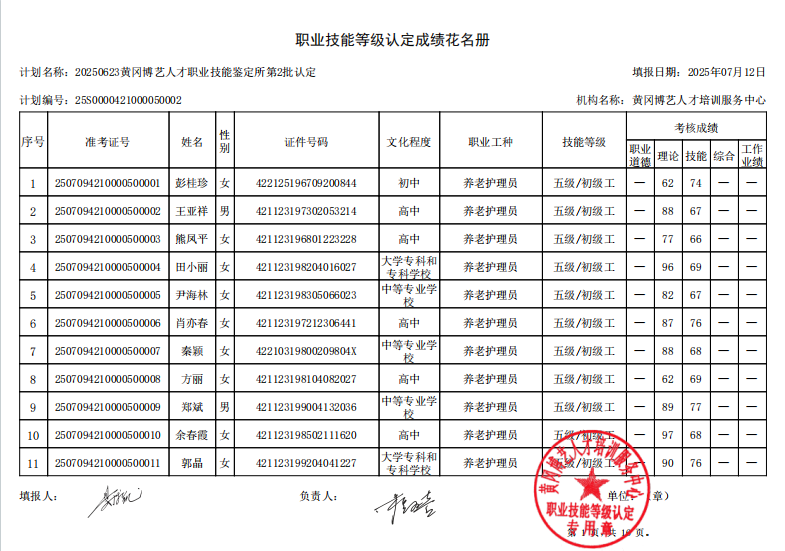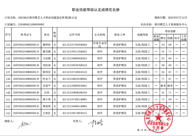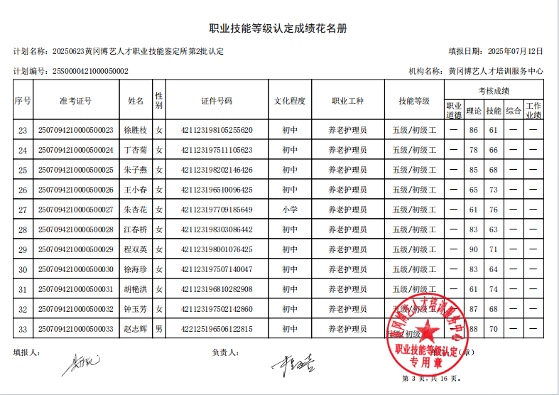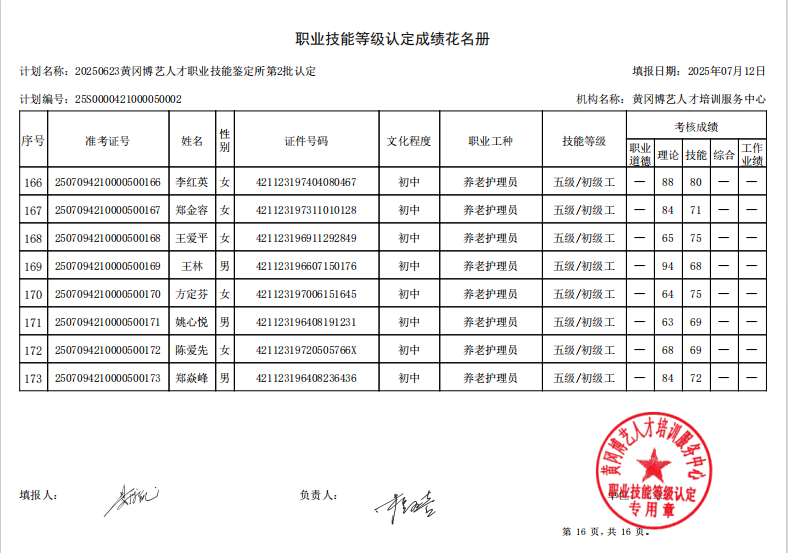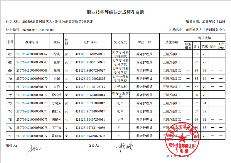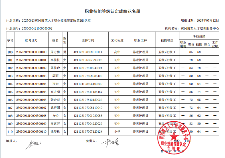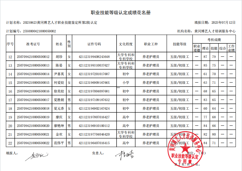 根据《关于印发<职业技能等级认定工作规程(试行)>的通知》(人社职司便函〔2020〕17号)、《湖北省人力资源和社会保障厅关于征集在湖北省开展职业技能等级认定社会培训评价组织的通告》(鄂人社函〔2020〕31号)等文件精神,为充分发挥我培训中心在技能人才培养、评价方面作用,实施人才强企战略,以增强企业核心竞争力为目的。建立健全技能人才队伍建设工作机制,完善技能人才培养、评价和激励的政策措施,建设技能精湛、素质优良、结构合理的技能人才队伍,逐步形成初级、中级、高级技能劳动者队伍梯次发展和比例结构基本合理的格局,使技能人才规模、结构、素质更好地满足企业发展的需要,我中心于2025年7月09日组织了养老护理员初级认定考试。