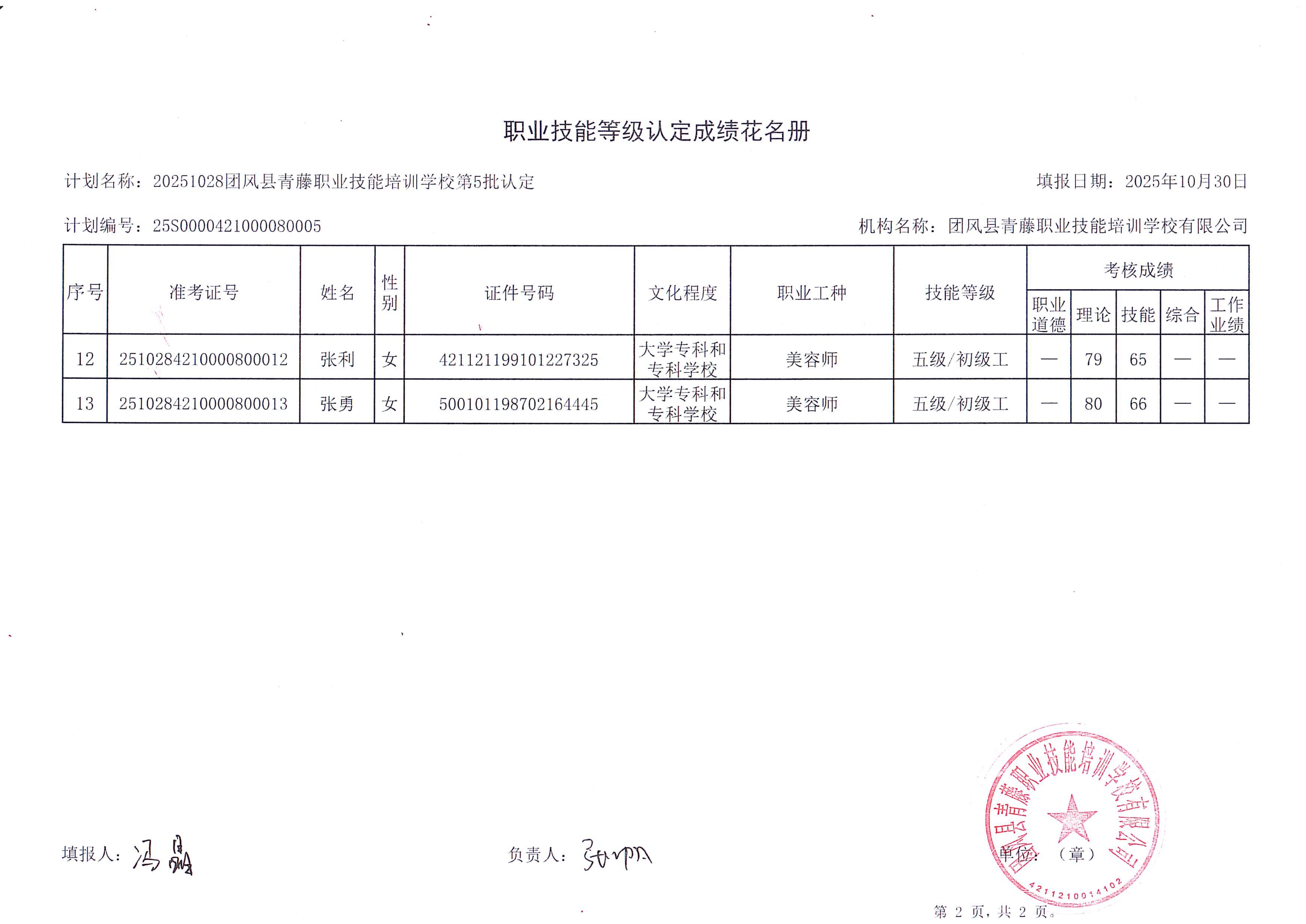 20251028团风县青藤职业技能培训学校第5批职业技能等级认定成绩公示