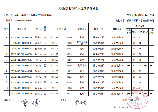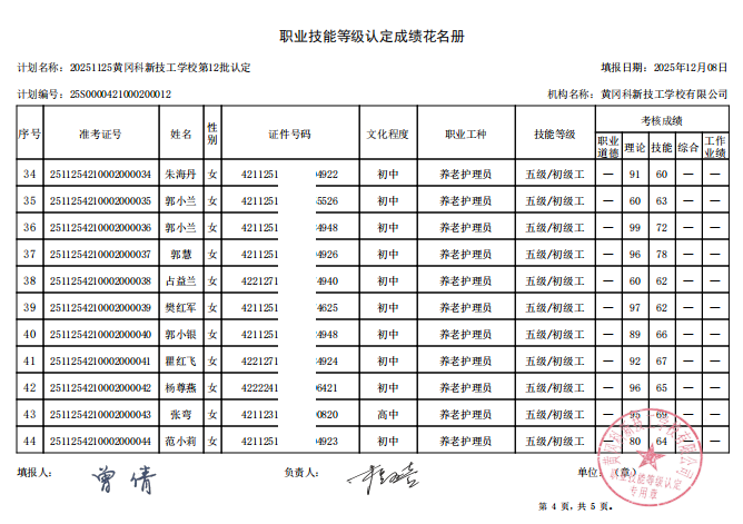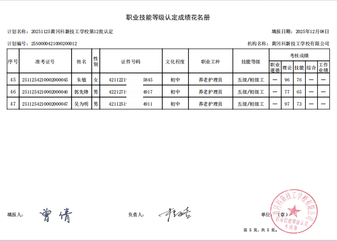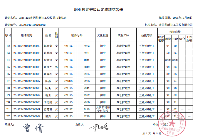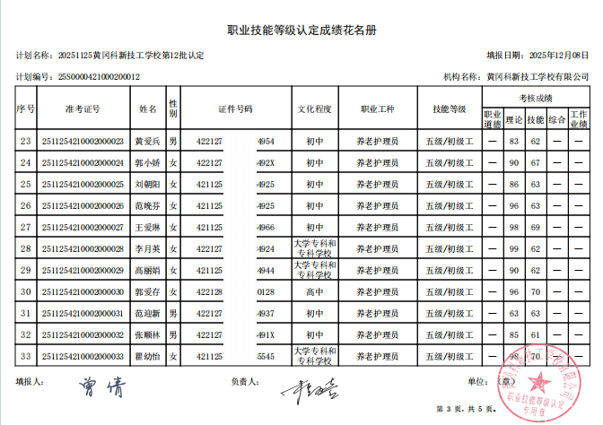 20251125黄冈科新技工学校第12批职业技能等级认定成绩公示