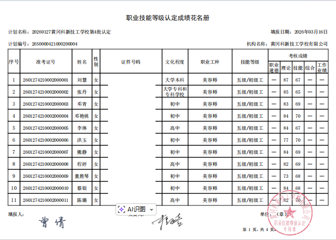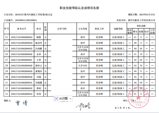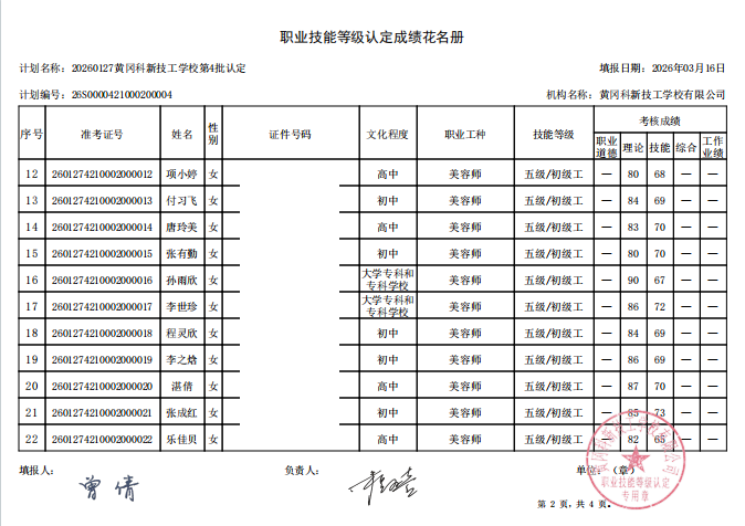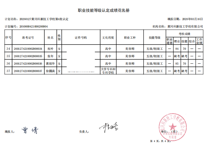 20260127黄冈科新技工学校第4批认定成绩公示